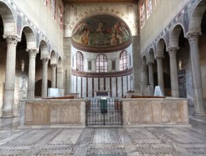 La schola cantorum — o coro basso — della basilica di Santa Sabina, risalente al pontificato di Eugenio II (824-827), fu smantellata nel XVI secolo da Domenico Fontana su incarico di Sisto V. Alla fine dell’Ottocento, Ferdinando Mazzanti ne recuperò e studiò le lastre originali, ricomponendole in un lapidario. Tra il 1913 e il 1936, Antonio Muñoz, nell’ambito dei lavori volti a eliminare le modifiche tardocinquecentesche della basilica, diresse la ricostruzione della recinzione, utilizzando e integrando i materiali rinvenuti da Mazzanti. L’attuale manufatto rappresenta dunque sia un elemento originario sia una testimonianza storicizzata dei restauri del XX secolo, richiedendo un progetto capace di valorizzarne la complessità storica e conservativa.