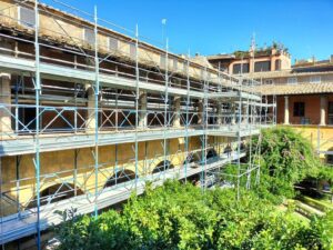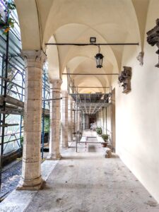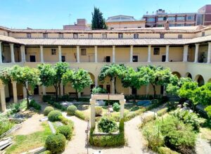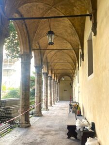 La chiesa di San Giovanni Battista dei Genovesi prende il nome dall’antico Ospedale, dove venivano accolti e curati i marinai genovesi non appena sbarcati nel vicino porto di Ripa Grande. L’Ospedale si articolava intorno ad un chiostro realizzato nella seconda metà del XV secolo ed attribuito a Baccio Pontelli, architetto di Sisto IV, e definito dal Vasari uno dei più belli della città. Le arcate a tutto sesto che delimitano il perimetro del piano inferiore (nove in ogni lato) sono rette da pilastri ottagonali in travertino, mentre la loggia superiore, ugualmente spartita da pilastri ma di dimensioni minori, è architravata. Sotto il portico destro si trova la porta di accesso all’oratorio della Confraternita, nel quale si trova il pregevole soffitto a cassettoni seicenteschi con stemmi, un arco a tutto sesto con pilastri che divide l’ambiente in due parti, ed affreschi con “Storie della Vergine e del Battista”. Nel cortile interno, tenuto a giardino, è posto un pozzo quattrocentesco costruito con grossi blocchi di travertino e con una trabeazione sorretta da due colonne ioniche.