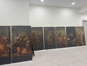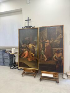 Dopo l’impegnativo intervento conservativo della cupola, concluso all’inizio del 2023, la Soprintendenza Speciale di Roma ha preso in carico il restauro delle quattordici tele della Via Crucis distribuite lungo le pareti della chiesa. Realizzate entro il 1794, le opere sono riferite al pittore siciliano Mariano Rossi e ad altri tre artisti attivi a Roma sul finire del XVIII secolo: Antonio Cavallucci, Giovanni Micocca e Domingos Antonio de Sequeira, detto il Portoghesino. È possibile che provengano da un oratorio vicino alla chiesa di San Francesco di Paola ai Monti, demolito per fare spazio a via Cavour alla fine dell’Ottocento. Per ognuna delle tele, dopo lo smontaggio dalla parete, si procederà al risanamento della cornice e del supporto, alla pulitura, stuccatura, integrazione pittorica e verniciatura della pittura. L’intervento sarà accompagnato da fotografie ad alta risoluzione, indagini diagnostiche ed elaborati grafici che chiariranno le tipologie di degrado. I dipinti sono attualmente trasferiti presso un laboratorio di restauro e saranno ricollocati in chiesa al termine dei lavori, nel giugno del 2026.