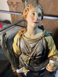 La Chiesa di Santa Maria Annunziata del Gonfalone, nota anche come Oratorio del Gonfalone, fu edificata tra il 1544 e il 1547 sui resti della Chiesa di Santa Lucia Vecchia per volontà dell’Arciconfraternita del Gonfalone, fondata nel 1274, e ricostruita dopo un incendio nel 1555. Il termine “gonfalone” significa “bandiera” o “stendardo” e richiama l’usanza della Confraternita che, nelle processioni, portava la bandiera del Papa a testimonianza della sua sovranità su Roma. L’aula rettangolare, con l’altare maggiore sopraelevato e gli ambienti retrostanti, fu completata con il soffitto ligneo, l’atrio e il coro entro il 1571, mentre la facciata fu ultimata da Domenico Castelli a metà Seicento. All’interno si conserva un ciclo di dodici affreschi raffiguranti le “Storie della Passione di Cristo”, realizzati da artisti di rilievo, che conferiscono all’oratorio il titolo di “Cappella Sistina del Manierismo”. L’intervento PNRR prevede la revisione della copertura, il recupero del soffitto ligneo dell’atrio, della pavimentazione in cotto bicromo dell’aula, la pulitura della facciata e il restauro della scultura lignea di Santa Lucia. Queste opere mirano a conservare e valorizzare uno dei complessi monumentali più significativi della storia dell’arte italiana.