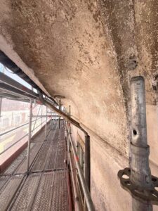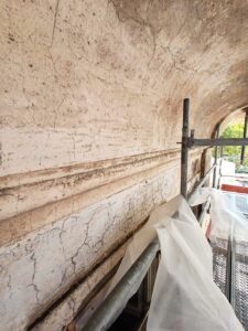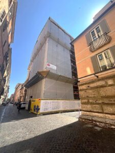 I lavori per l’edificazione della chiesa, della Casa e dell’Oratorio di Santa Maria del Suffragio iniziarono nel 1616, su progetto di Carlo Rainaldi, con elargizione del cardinale Bartolomeo Ruspoli, per la Confraternita del Suffragio che fin dall’anno 1592 si riuniva nella vicina chiesa di San Biagio. Terminati nel 1669, nel 1874 la chiesa fu restaurata dall’Armellini. Le facciate del convento presentano un impianto compositivo molto semplice: il fondo in intonaco liscio è scandito da cinque ordini di aperture regolari incorniciate da fasce in travertino ed è coronato da un semplice cornicione a guscio. Sulla facciata prospiciente via Giulia tutte e tre le finestre del terzo ordine, orbate già in antico, presentano tracce di decorazioni policrome a trompe-l’oeil raffiguranti infissi dipinti. L’intervento nella chiesa di Santa Maria del Suffragio prevede il restauro delle facciate del complesso conventuale su via Giulia e su via dei Bresciani e il restauro della copertura lignea.