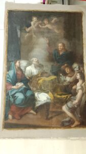 L’oratorio, posto alla sinistra della chiesa intitolato alla Dottrina Cristiana, fu ideato dal parroco Gioacchino Maria Oldo per l’istruzione religiosa dei fedeli di Borgo e finanziato dal cardinale Giuseppe Sacripante, titolare della chiesa. I lavori per la costruzione iniziarono nel 1714 su progetto dell’architetto Nicola Michetti e terminarono l’anno successivo. L’ambiente, a forma rettangolare molto allungata, è reso armonioso dalla scansione di lesene che si intervallano a nicchie ampie e poco profonde. Sulla volta vi è un riquadro affrescato eseguito da Giovanni Conca raffigurante la Vergine con il Bambino tra i santi carmelitani Eliseo, Elia, Teresa, Alberto, Angelo da Licata e Maddalena De’ Pazzi. Sulla parete destra sono collocati quattro tele dello stesso artista, eseguite intorno al 1715. L’altare maggiore è invece decorato con una tela di Luigi Garzi raffigurante Gesù che insegna. L’intervento PNRR prevede il rifacimento delle coperture e il restauro di tutte le superfici decorate e delle tele.