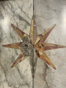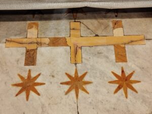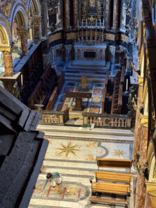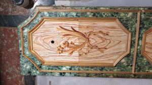 - Restauro dei pavimenti tramite integrazione di frammenti di tarsie marmoree, realizzate con la tecnica antica del commesso fiorentino, per le lacune pavimentali della navata centrale. Le tarsie sono realizzate in marmi antichi: Giallo Antico Carnicino della Numidia e Rosso Antico di Grecia, ogni pezzo è stato sagomato manualmente con archetto a violino e fiammato. — Fonte: Lares Restauri