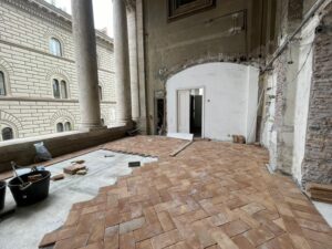 - Ripristino e restauro del loggiato: demolizione della superfetazione (che ha permesso il ritrovamento di apparati decorativi preesistenti) e realizzazione del nuovo massetto di posa. — Fonte: Lares Restauri