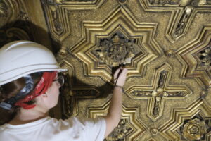 - Pulitura, stuccatura, riadesione dei frammenti e reintegrazione pittorica delle lacune delle volte in stucco dorato. — Fonte: Lares Restauri