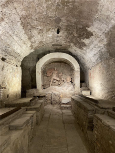 Gli scavi sotto la chiesa di Santa Prisca, iniziati nel 1934 dai Padri Agostiniani e proseguiti poi dall’Istituto Storico Olandese, hanno rivelato l’esistenza di un luogo di culto dedicato a Mitra che, nel corso del III sec. d.C., occupò un più antico e vasto complesso residenziale. La sala principale conserva sulle pareti gli affreschi raffiguranti la processione degli addetti al culto; sul fondo la nicchia con il gruppo di Mitra che uccide il toro e una statua di Saturno sdraiato, il cui corpo è costituito da anfore coperte di stucco. In un grande graffito un fedele dichiara di essere nato alla luce (rinato in seguito all’iniziazione) il 21 novembre 202 d.C. Casa Bellezza, viene scoperta nel 1958 durante i lavori di ristrutturazione del villino del direttore d’orchestra Vincenzo Bellezza. I resti appartengono al piano interrato di una domus, nel quale due ambienti affrescati si aprono su un criptoportico a tre bracci. La decorazione consente la datazione alla fine del I sec. d.C.