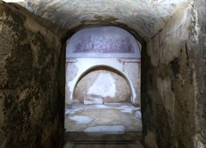 L’Ipogeo degli Ottavi, così denominato dalle iscrizioni sulla fronte dei sarcofagi ivi rinvenuti, venne scoperto nel 1921 durante l’edificazione di alcuni villini, presso il km 9 della via Trionfale. Per il clamore della scoperta, la località prese il nome di Ottavia, dal gentilizio della famiglia sepolta nell’ipogeo. Vi si accede dal villino al civico 73 di via della Stazione di Ottavia, viabilità che ricalca un antico asse viario secondario, il quale, straccandosi dalla via Triumphalis all’altezza del VI miglio, si inoltrava verso ovest fino a raccordarsi con la via Cornelia. La costruzione dell’Ipogeo risale alla prima metà del III secolo d.C., come indicato dalla datazione dei sarcofagi e delle pitture, fra queste la più nota è l’affresco del viaggio nei Campi Elisi che evoca la morte della giovanissima Octavia Paulina. Il Ninfeo della Lucchina (anche detto Ninfeo di Selva Candida) venne in luce nel 1990 durante i lavori per la realizzazione dell’area di servizio Selva Candida interna presso il km 8,700 del Grande Raccordo Anulare in occasione dei Mondiali Italia ‘90. L’edificio, a pianta centrale, semi-ipogeo, faceva parte di una villa suburbana con continuità insiediativa dal I secolo a.C. al IV secolo d.C. Un corridoio lungo 8 m e largo 1,5 m, coperto a volta, decorato da affreschi e mosaici pavimentali, immette in una rotonda del diametro di 5,20 m conservata per un’altezza massima di 4,30 m. Nel corso dello scavo vennero recuperati reperti di notevole interesse: frammenti di riquadri musivi policromi a piccole tessere di calcare e paste vitree (emblemata), sculture in marmo, tra cui una testina di Apollo, un torso maschile, un sostegno con pelle leonina attribuibile a Eracle. L’intervento PNRR prevede il restauro degli apparati decorativi dei monumenti al fine di salvaguardare e valorizzare i due siti in previsione della loro riapertura al pubblico. I lavori comprendono inoltre la coibentazione delle aperture in entrambi i siti e l’installazione di nuovi impianti elettrici. Presso il Ninfeo della Lucchina, lo scavo archeologico consentirà l’individuazione e la documentazione della originaria rampa di accesso al monumento ricavata nel banco tufaceo.